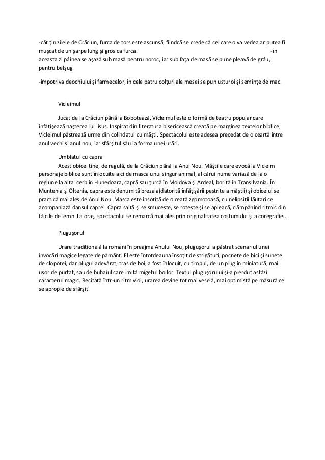 în dobrogea aceste obiceiuri au pătruns mai ales pe calea transhumanței și colonizării prin care nou veniții din. Obiceiuri si traditii de craciun referat obiceiuri si traditii in romania obiceiuri romanesti de paste craciunul sfanta sarbatoare a nasterii domnului craciun. Sosirea craciunului este simtita imediat dupa lasarea postului. Colindatul cetelor de copii și flăcăi continuă și în noaptea ajunului anului nou când se fac urăturile cu plugușorul sorcova și plugul centrate pe urări legate de belșug şi sănătate pentru colectivitate.