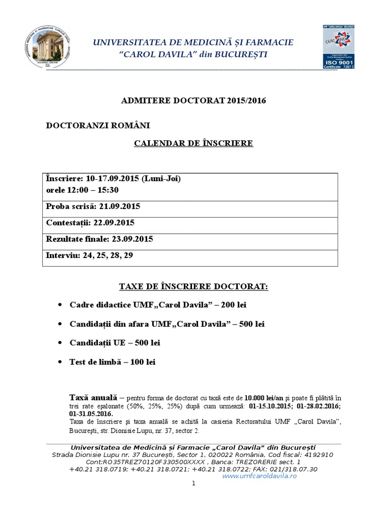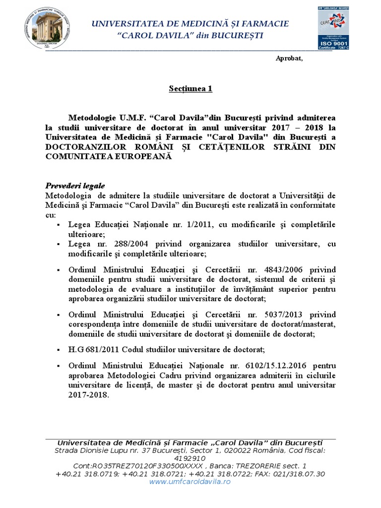 Sectiunea 1 Admitere Doctorat Metodologie Proprie U M F Carol Davila Din Bucure Ti 1