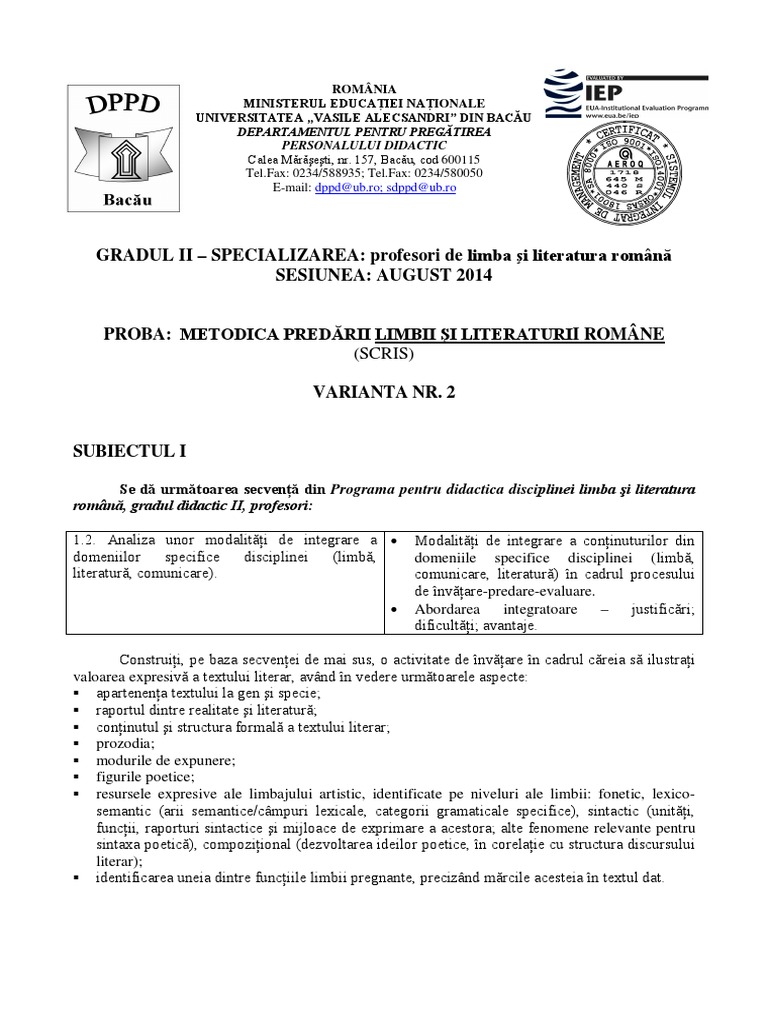 Subiecte Gradul Ii Profesori Litere Bacau