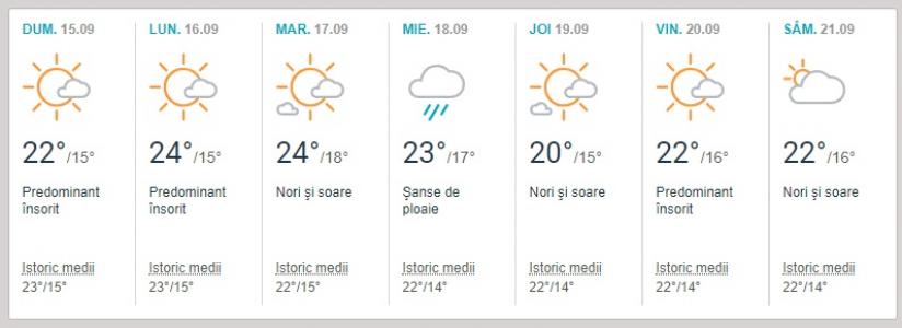Prognoza meteo a lunii septembrie pentru restul țării. La nivel de zi prognoza meteo este impartita pe intervale orare din 3 in 3 ore si contine urmatorii parametri meteorologici. La nivel de zi prognoza meteo este impartita pe intervale orare din 3 in 3 ore si contine urmatorii parametri meteorologici. O pictograma cu starea vremii temperatura reala si cea resimtita scurta descriere a conditiilor atmosferice probabilitatea de precipitatii cantitatea de precipitatii umiditatea aerului viteaza vantului rafale de vant viteza maxima a vantului directia vantului.
